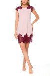Koszulka nocna uszyta z przyjemnego i oddychającego materiału to jedna z naszych jesiennych propozycji. Do uszycia tego modelu wybrałyśmy dzianinę o pastelowym odcieniu różu, który przełamałyśmy kontrastową koronką w kolorze wina. Mały rękawek subtelnie osłaniający ramię stworzony jest właśnie z tej delikatnej koronki. Podobnie jak dół koszulki nocnej: szeroki pas koronki połączony z dzianiną nienachlanie eksponuje ciało. Pozornie klasyczny fason tej uroczej koszulki do spania zyskał zupełnie nowego charakteru dzięki kontrastowym, ręcznie wycinanym koronkom.