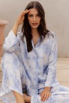 Klasyczna damska dwuczęściowa piżama. Góra piżamy to koszula z kołnierzykiem zapinana na guziki. Dół piżamy to luźne spodnie z gumką w pasie i z kieszeniami po bokach. Piżama uszyta jest z naturalnej, oddychającej wiskozy ECOVERO w piękny letni wzór – delikatne kwiaty na tle obłoków. Wiskoza ECOVERO jest materiałem naturalnym, przewiewnym i delikatnym dla skóry.