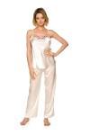Subtelna, zmysłowa, glamour – taka jest ona, satynowa piękność, seksowna piżamka zdobiona pięknym haftem. Bogactwo zdobień nie przyćmiewa, a tworzy przemyślaną całość, która sprawi, że każdy poranek będzie wyjątkowy. Góra piżamki to top na cienkich ramiączkach – z dekoltem ozdobionym haftem. Dół piżamki to satynowe proste spodnie. Fason dostępny w dwóch kolorach.