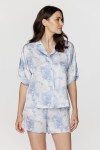 Klasyczna damska dwuczęściowa piżama. Góra piżamy to koszula z kołnierzykiem zapinana na guziki – w tej wersji z krótkim rękawem. Dół piżamy to luźne szorty z gumką w pasie i z koronkowymi zdobieniami po bokach. Piżama uszyta jest z naturalnej, oddychającej wiskozy ECOVERO w piękny letni wzór – delikatne kwiaty na tle obłoków. Wiskoza ECOVERO jest materiałem naturalnym, przewiewnym i delikatnym dla skóry.