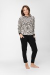 Dwuczęściowa piżama damska składa się z wiskozowej bluzki z długim rękawem i prostych spodni uszytych z oddychającego micromodalu.
