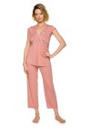 Damska piżamka uszyta z oddychającego micromodalu. Góra piżamy to koszulka, której pogłębiony dekolt ozdobiony jest haftem, zdobiącym również odcięcie pod biustem. Koszulka ma krótki rękawek ozdobiony marszczeniem. Z przodu znajduje się pliska, dzięki której koszulka ładnie układa się na każdej figurze. Dół piżamy to klasyczne, proste spodnie, które z powodzeniem można zakładać jako wygodny strój po domu.
