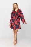 Przepiękny kolorowy szlafrok uszyty z wzorzystej satyny. Czerwone i niebieskie kwiaty na czarnym tle idealnie wpisują się w modowe jesienne trendy. Wzorzysty szlafrok świetnie sprawdzi się o każdej porze roku, dodając koloru sypialnianym stylizacjom.