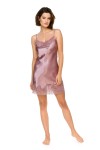 Koszulka nocna uszyta z jedwabistej i pięknie układającej się satyny. Nasza satyna nie elektryzuje się i jest wytrzymała, mimo że jednocześnie jest lekka i delikatna. Koszulka ozdobiona jest koronką, która w tym modelu wychodzi na pierwszy plan. Koronka zdobi dół koszulki, jej przód oraz tworzy niesamowity dekolt na plecach. Cienkie regulowane ramiączka pozwalają dopasować długość koszulki do sylwetki. Do kompletu można dokupić szlafrok. Bielizna nocna z tej kolekcji dostępna jest w dwóch kolorach: pięknym przydymionym różu oraz w klasycznej czerni.