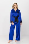 Damska piżama uszyta z jedwabistej satyny. Ręcznie wycinane koronkowe elementy zdobią przód piżamy. Subtelna koronka ozdabia również zakończenia rękawów. Góra piżamy to koszula zapinana na guziczki, przewiązywana w pasie czarnym, eleganckim paskiem. Piżamę zaprojektowałyśmy w dwóch przepięknych kolorach: czerwonym oraz niebieskim.