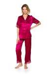 Subtelna, zmysłowa, glamour – taka jest ona, satynowa piękność, piżama zdobiona ręcznie wycinanymi koronkami. Bogactwo zdobień nie przyćmiewa, a tworzy przemyślaną całość, która sprawi, że każdy poranek będzie wyjątkowy. Góra piżamki to satynowa koszula zapinana na guziczki z rękawami zdobionymi koronką. Dół piżamy to wygodne satynowe spodnie, których dół również ozdobiłyśmy koronką. Fason dostępny w dwóch kolorach.