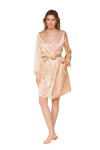 Satynowy szlafrok z rękawem zdobionym koronką to nasza propozycja nie tylko na lato. Miękka satyna w cielistym odcieniu w połączeniu z ręcznie wycinaną koronką tworzy przyjemne, wakacyjne połączenie.