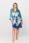 Szlafrok uszyty jest z przepięknej wzorzystej tkaniny, na której kolorowe kwiaty tworzą malowniczy zimowy ogród. Szlafrok można połączyć z koszulką nocną uszytą z tej samej jedwabistej satyny, tworząc piękny wieczorowy komplet.