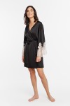 Damski szlafrok o długości przed kolano, uszyty z satyny. Rękawy szlafroka ozdobione są ręcznie wycinaną kontrastową koronką. Jedwabista satyna, z której uszyto ten fason, jest miękka, niezwykle delikatna, przyjemna w dotyku, a dodatkowo pięknie układa się na ciele. Szlafrok dostępny jest w 3 kolorach.
