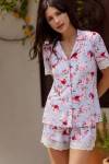 Damska piżama z oddychającego micromodalu w śliczny kwiatowy wzór na błękitnym tle. Góra piżamy to koszula zapinana na guziki z krótkim rękawkiem wykończonym koronką. Dół piżamy to szorty z koronkowym wykończeniem dodającym całości lekkości i uroku.