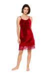 Piękna welurowa koszulka nocna dostępna w dwóch soczystych kolorach: czerwonym oraz granatowym. Dół oraz tył koszuli nocnej zdobią koronkowe wstawki, dodające modelowi lekkości i uroku. Welur bambusowy to materiał oddychający, antyalergiczny i przyjemny w dotyku. Elegancki połysk weluru w połączeniu z ręcznie wycinanymi koronkami świetnie sprawdzi się jako elegancka bielizna nocna.